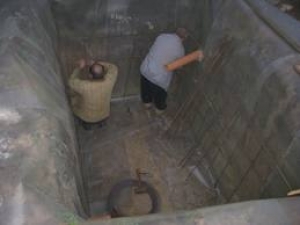 После того как вы обложили дно и стороны ямы, нужно конечно и к верхушке ямы приступать. Здесь так же можно одну большую плиту положить, в которой по серединке сделать отверстие для канализационного люка оставить. Таким образом, у вас будет хорошо заизолированная яма, и запахи не будут распространяться. А выкачивают же с помощью простой трубы, которая в себя всё всасывает.