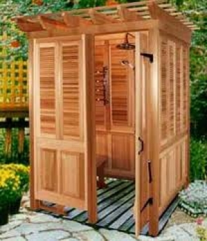Построить душ не проблема, это может быть простое сооружение со стен, и на дне которого можно просто даже поддона поставить, а на него доски положить. Это простое приспособление, но тогда вам надо запомнить самое главное. А именно, что на крыше стоит поставить или бочку, или просто воду провести.